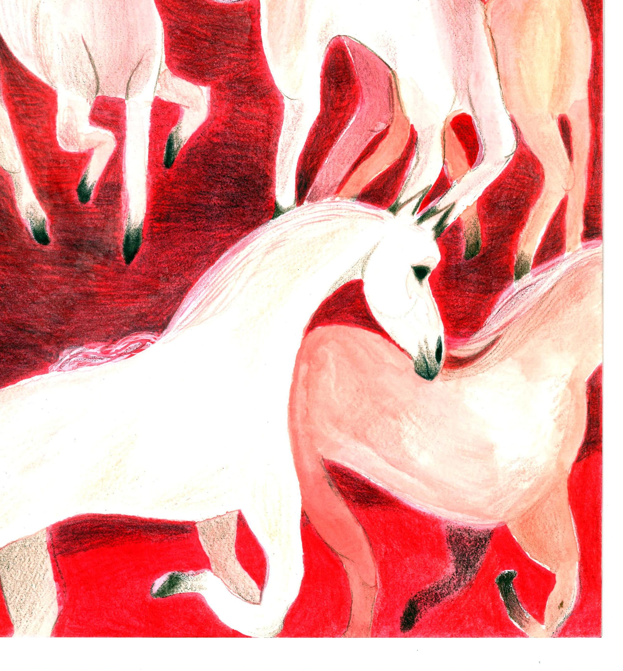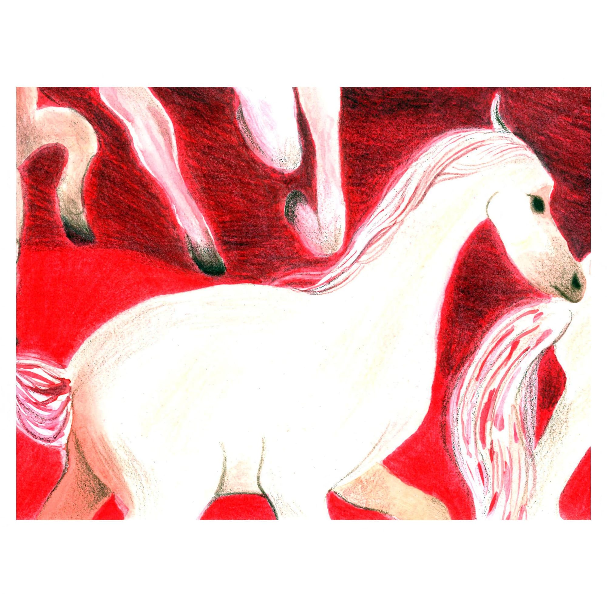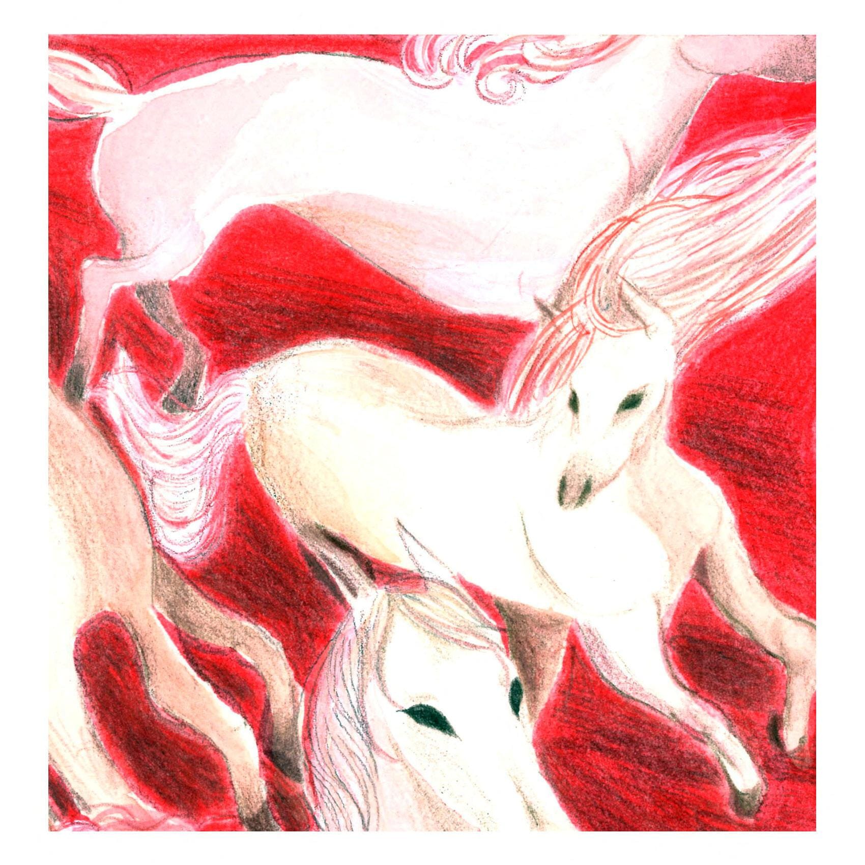 Personal drawing of boy surrounded by galloping white horses, inspired by Patti Smith's song Land: Horses. Created with watercolours, ink, graphite and colour pencils on paper, 2026.